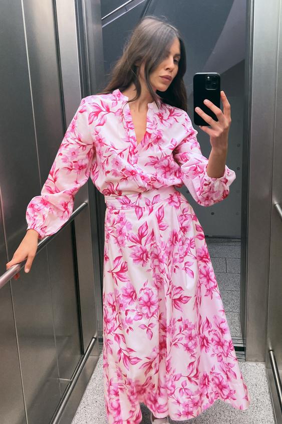 Cuenta con una blusa estampada a juego disponible también en la web de Zara a un precio de 27,95 euros. Una blusa de cuello redondo con escote pico y manga larga. Esta falda estampada se puede encontrar en la web de Zara en las tallas de la XS a la XL y a un precio de 39,95 euros. Si te encanta esta falda estampada 100% algodón, acude pronto a las tiendas de la conocida firma porque quedan pocas unidades en algunas tallas.