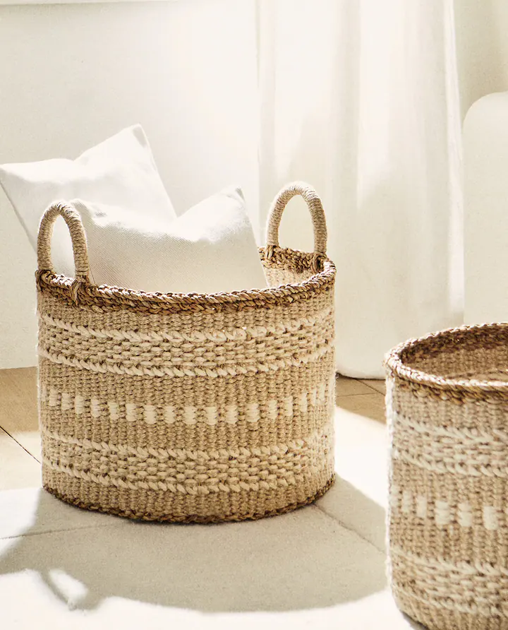 Otra de las que más nos gustan para esta primavera del catálogo de Zara Home es esta cesta de yute con cenefas en color beige a contraste. Una cesta que destaca por su original diseño con asas en los laterales y está disponible en varios tamaños. Otra cesta de yute es también una buena opción para mantener la casa en orden y, además, es estéticamente perfecta para cualquier habitación de una vivienda en el campo o en la ciudad.