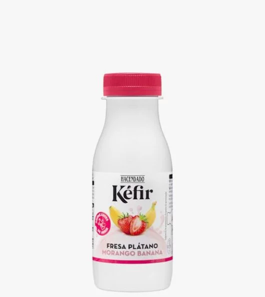 La bebida Kéfir de fresa y plátano Hacendado es una versión más dulce y afrutada del Kéfir tradicional en la que se combina la leche fermentada de vaca con puré de plátano y fresa, azúcar y edulcorante. Una bebida láctea muy nutritiva y saludable. El kéfir de fresa y plátano aporta el 20% de la cantidad diaria recomendada de calcio y el 15% de la de proteínas. Esto se une a que tiene un bajo contenido en grasa y solo 57 calorías por 100 gramos.