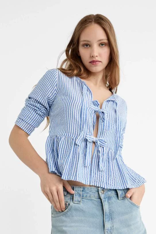 Este verano, la marca de moda Stradivarius nos sorprende con una nueva versión de la clásica blusa de rayas. ¡Olvídate de los botones! Esta vez, la firma apuesta por un diseño fluido y moderno con cierre de lazos que le da un toque elegante y femenino. Confeccionada con tejidos ligeros y frescos, esta blusa se convierte en la prenda imprescindible para lucir un look trendy y cómodo durante los días calurosos.