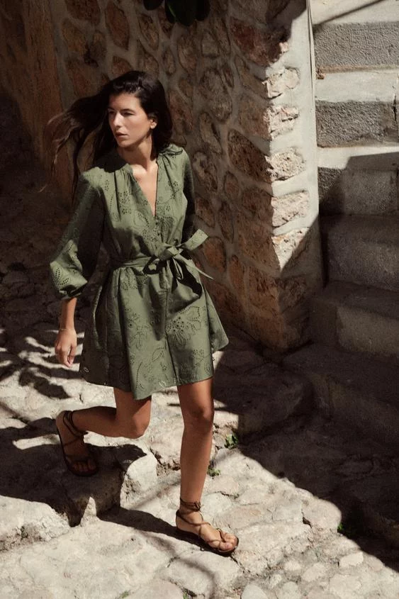 El segundo en el que nos hemos fijado es en este vestido corto en verde de diseño camisero. Un original vestido perfecto para estos primeros días de entretiempo y que queda genial con unas sandalias. Este vestido corto de cuello redondo con escote pico y manga por debajo del codo acabada en elástico sorprende por su detalle de bordados perforados con tejido engomado.