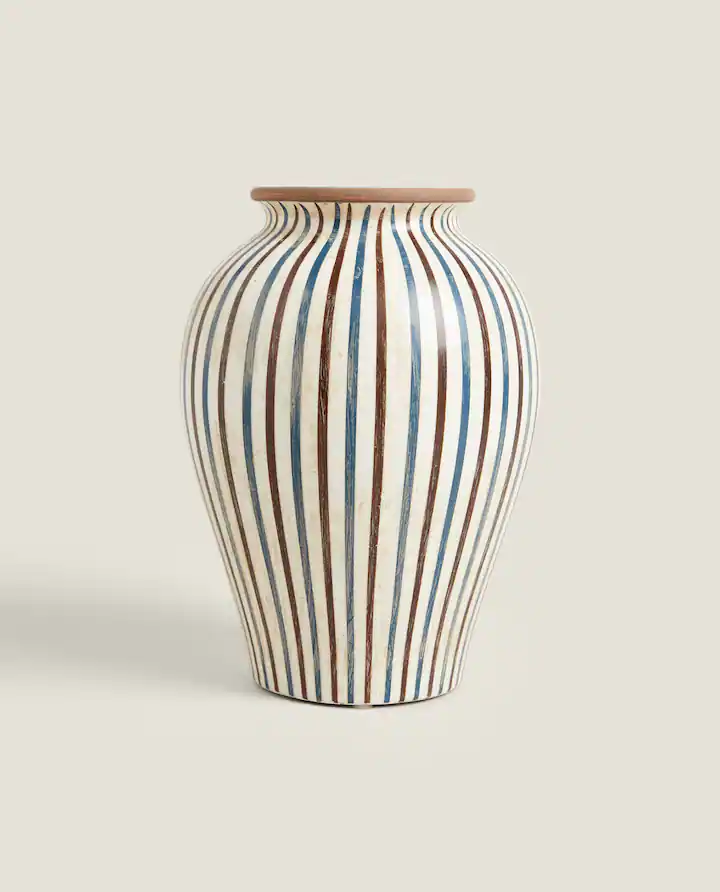 También nos hemos fijado en este jarrón de cerámica con diseño de rayas de colores tan original. Este jarrón 100% gres también puede contener agua por lo que se pueden poner flores en algún momento. Se puede encontrar en la web de Zara Home en la medida de 25 cm de alto, 18 cm de ancho y 18 cm de alto a un precio de 29,99 euros. Un jarrón que solo pesa