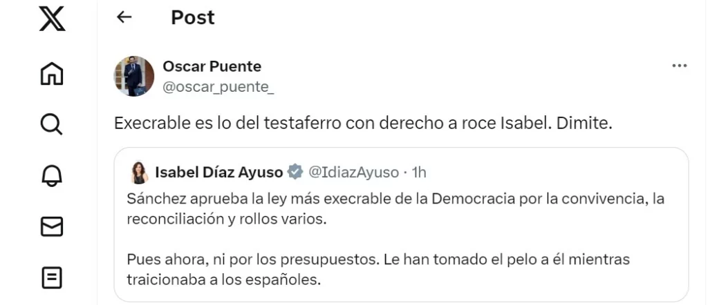 Óscar Puente tampoco iba a dejar pasar este tema por alto y apuntaba que «tendría que haber dimitido ya. Se hace insostenible asistir a un relato tan falaz. Y más aún tratar de entender el porqué de tanta mentira y tan grosera si se trata de un ciudadano particular y sus conductas no le atañen a ella». En su caso, hacía este comentario con el video de Ayuso en la rueda de prensa del Consejo de Gobierno.