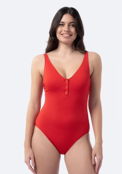 Otro de los bañadores que se cuelan en esta selección vuelve a tener el color rojo como gran protagonista. En este caso, además, llama la atención gracias a detalles como sus aros, así como por su forro, que lo convierte en una opción cómoda para llevar en la piscina o la playa a diario. Por su parte, destaca a su vez por el detalle de botones en el escote, que le aporta un toque diferente, pero sin renunciar a la elegancia. Si hablamos de su precio, te puedes hacer ya con él por tan solo 19,99 euros. Además, también lo tienes disponible en el color azul marino que nunca falla.