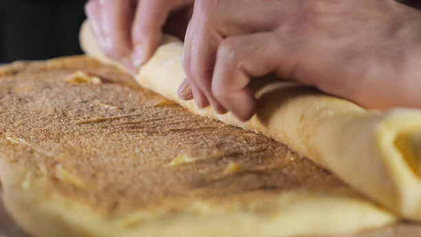 Con cuidado, enrollamos la masa desde un extremo largo hasta el otro, formando así los rolls de canela. Opcionalmente, esparcimos 1/2 taza de nueces picadas sobre el relleno antes de enrollarla para añadir un toque adicional de sabor y textura. Luego cortamos el rollo en rodajas de aproximadamente 2-3 cm de grosor y las colocamos en una bandeja para hornear. Después, horneamos a 180 °C durante 15-20 minutos hasta que estén doradas y listas para disfrutar.