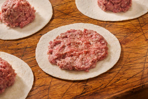 Una vez listas las tortillas, es momento de agregar la carne picada sazonada con sal, pimienta, ajo y cebolla en polvo. Cocinamos la carne en la misma sartén con un poco de aceite y luego las doblamos para darles la forma característica de taco. Para terminar de cocinar la carne y lograr un toque crujiente, las llevamos al horno pinceladas con una mezcla de aceite, ajo y perejil durante unos minutos.