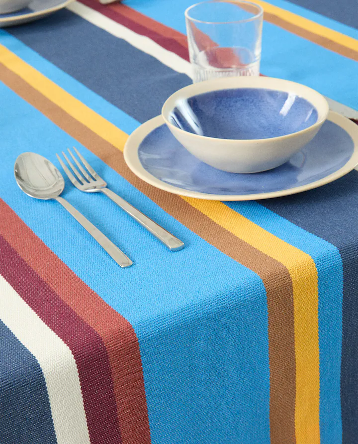 Para la primavera o el verano se suelen elegir modelos de manteles con un toque marinero, con rayas o con anclas, con estampados florales o frutales y también con colores neutros como blanco, amarillo, azul o verde. Manteles con los que estar a gusto en el jardín y que se puedan combinar con cualquier cubertería o vajilla