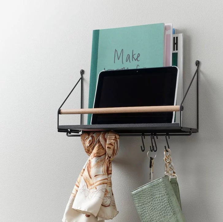Este organizador de pared llama la atención, a su vez, gracias a su elegante diseño, que combina lo mejor del color negro con la madera para encajar con cualquier tipo de decoración. Su estante cuenta con un borde para que no se caiga ningún objeto y, debajo, encontrarás un riel para colgar los cuatro ganchos que vienen incluidos en el paquete. De este modo, con tan solo un accesorio, serás capaz de transformar una zona que no utilices en un espacio práctico ideal para guardar y colocar esas cosas pequeñas que tenemos por casa y que nos gusta que estén a la vista o que necesitamos que estén siempre a mano.