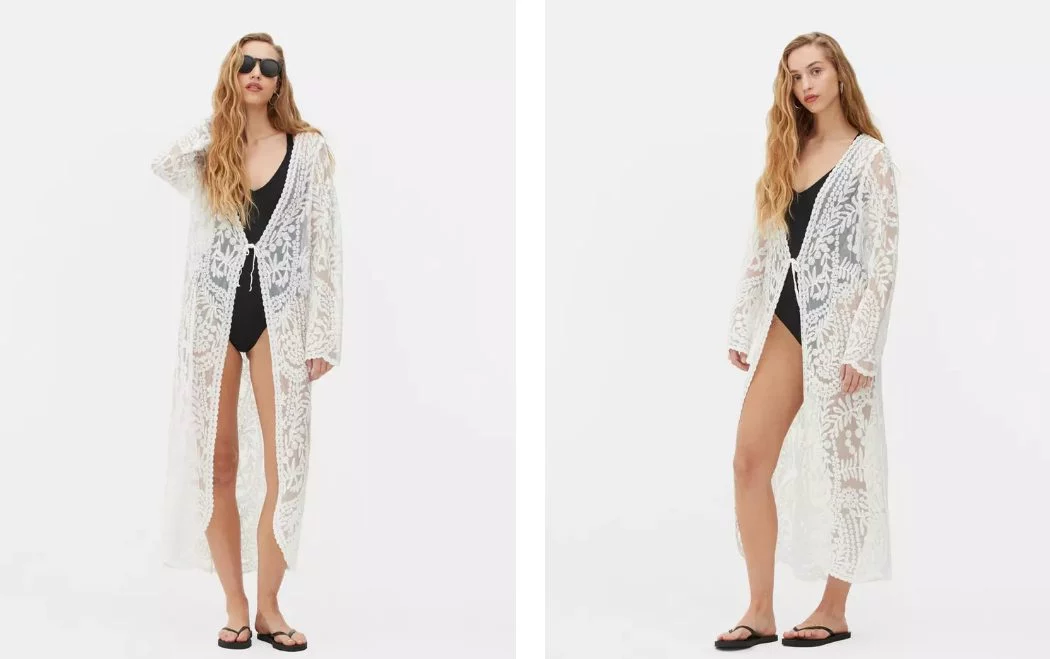 Otro de los complementos para el bikini o el bañador que logran atraer todas las miradas esta temporada es este kimono de Primark. De diseño largo y muy favorecedor, está elaborado con encaje, lo que no hace más que sumarle elegancia. Además, está disponible en color blanco, lo que lo convierte en la pieza ideal para combinarlo con cualquier otra prenda y accesorio de tu armario. Con lazo en la cintura, para asegurar una mejor sujeción y mayor comodidad, lo puedes conseguir ya por tan solo 17 euros en la tienda.