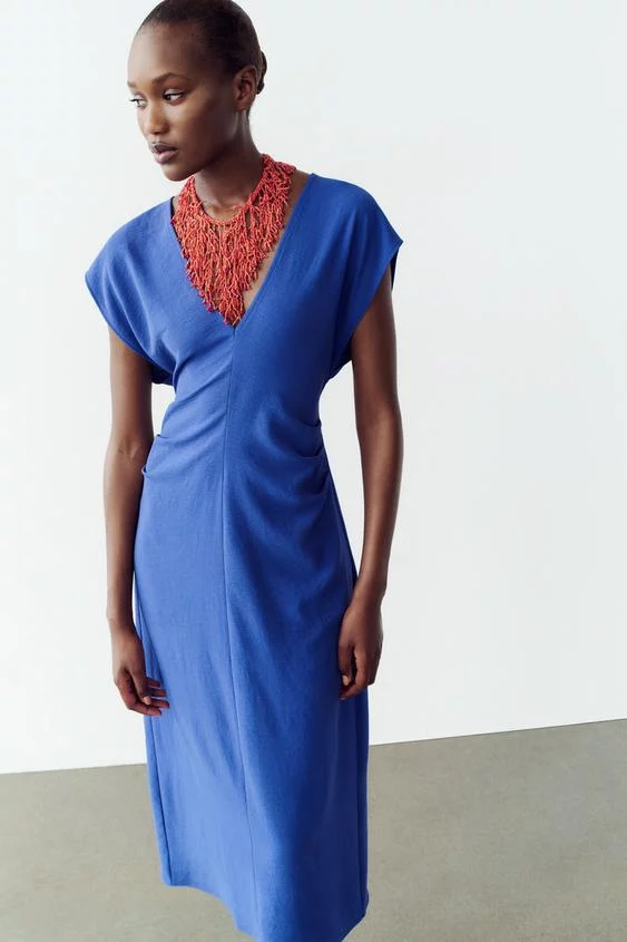 Otro que nos encanta es un vestido confeccionado con lino y algodón. Un favorecedor vestido que cuenta con cuello solapa y manga corta acabada en vuelta con trabilla y botón. Este vestido sorprende por un bajo con aberturas laterales y cierre frontal con botones y cinturón del mismo tejido. Uno de los vestidos más favorecedores del catálogo de Zara para esta temporada. Un original vestido que se puede encontrar en la web de Zara en las tallas XS a la XXL y a un precio de 39,95 euros. En la web de Zara se indica que falta ya en algunas tallas por lo que si te gusta es mejor que vayas a probártelo a una de sus tiendas.