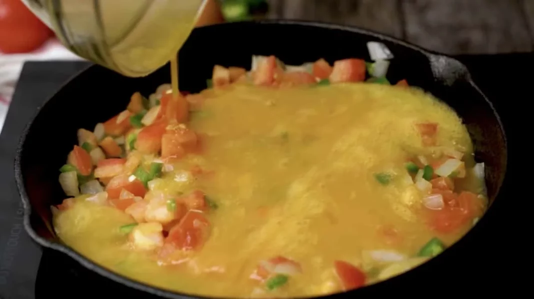 Mientras las verduras se cocinan, rompe los 8 huevos en un tazón grande. Bate ligeramente los huevos con un tenedor o un batidor de mano. Añade sal al gusto y mezcla bien. Una vez que las verduras estén listas, reduce un poco el fuego y vierte los huevos batidos en la sartén con las verduras.