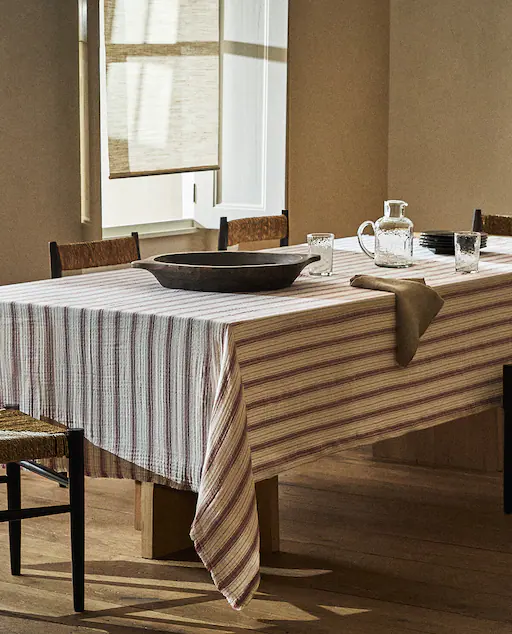 Un mantel 100% algodón que se puede encontrar en la web de Zara Home de 6 a 8 comensales (150 x 250 cm) de 69,99 euros. El fabricante recomienda un lavado a máquina a máximo 30º C en centrifugado corto, no usar lejía ni blanqueador, ni usar secadora. En cuanto al planchado, lo ideal es plancharlo al revés a un máximo de 110º C.