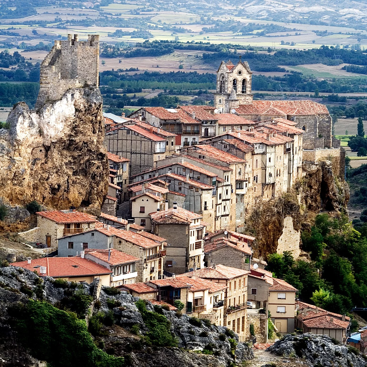 Desde lejos, Frías ya te enamorará. Situado sobre el río Ebro, este encantador pueblo se alza en un peñasco dentro del Parque Natural Montes Obarenes. Se accede a él a través de un puente levadizo, lo que añade un toque de misterio y encanto. Frías tiene todos los ingredientes para ser el escenario de un cuento: foso, castillo, fortaleza y unas impresionantes casas colgadas que no te dejarán indiferente.