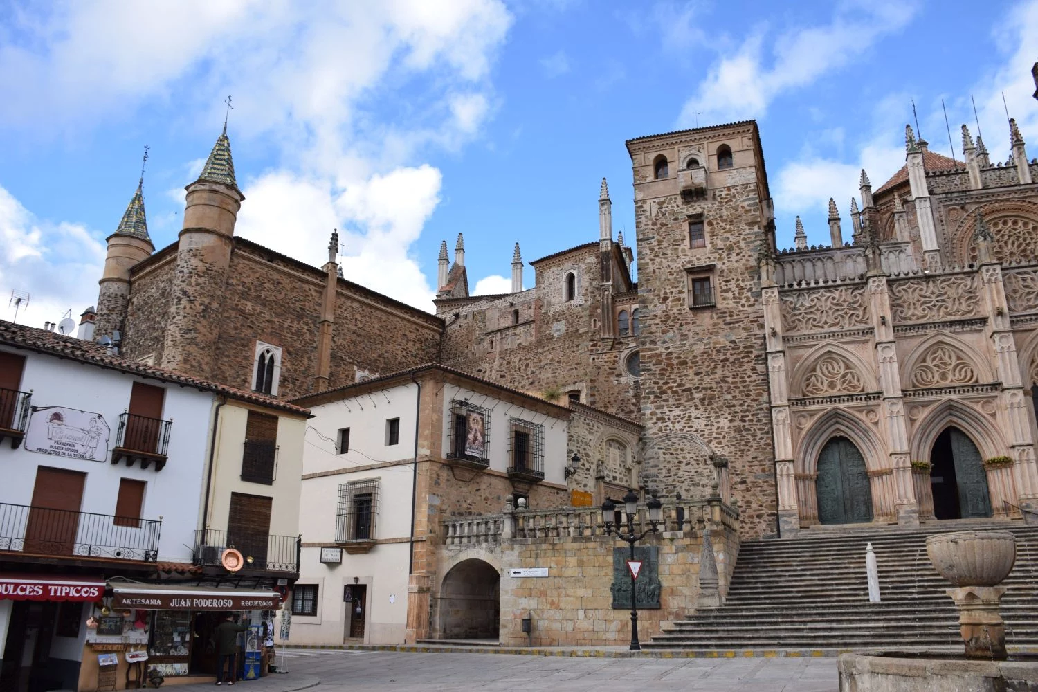 Guadalupe, en Cáceres, destaca por su monasterio que fusiona estilos arquitectónicos desde el mudéjar al gótico, pasando por el barroco, el renacentista y el neoclásico, con una historia rica en eventos, como la reunión de Cristóbal Colón y los Reyes Católicos antes de su viaje a América. Además, el pueblo ofrece gastronomía tradicional, hermosas flores y paseos pintorescos. Una visita obligada es contemplar las vistas desde el risco de La Villuerca, el punto más alto del Geoparque de Villuercas Ibores Jara.