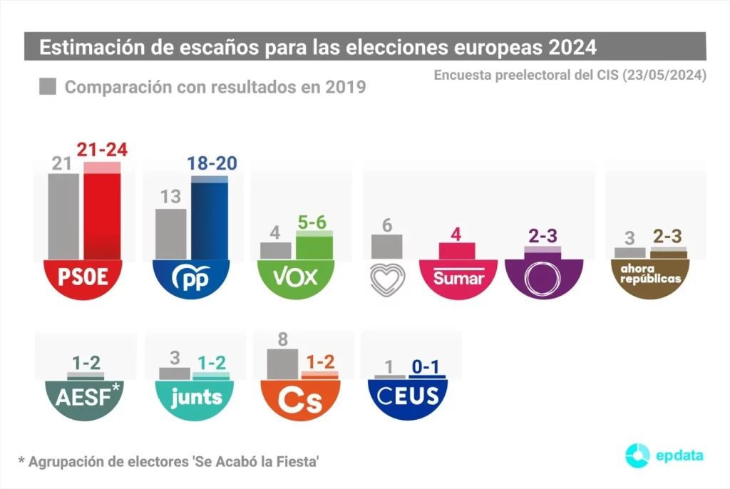 Mientras que Ciudadanos, que en las pasadas elecciones europeas de 2019 quedó tercero. En esta ocasión, Jordi Cañas revalidaría la posición de la formación naranja en Europa, pero solamente conseguiría entre uno y dos escaños. Al igual que el periodista Alvise Pérez