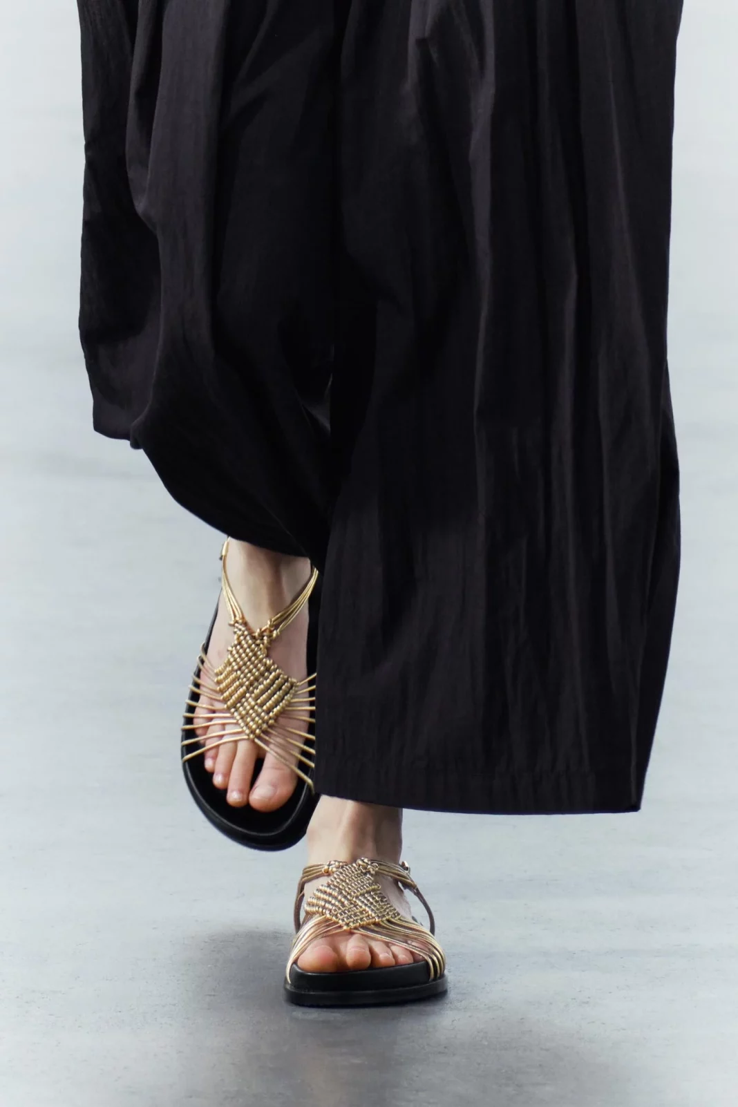 La primera que hemos elegido es esta sandalia plana con tiras finas y adorno metálico en el dedo. Sorprende por su cierre mediante hebilla y es una de las sandalias planas más cómodas y elegantes. También cuenta con una altura de la suela de 1,5 cm. Se puede encontrar en la web de Zara de la talla 35 a la 42 en tono blanco y negro a un precio de 29,95 euros.