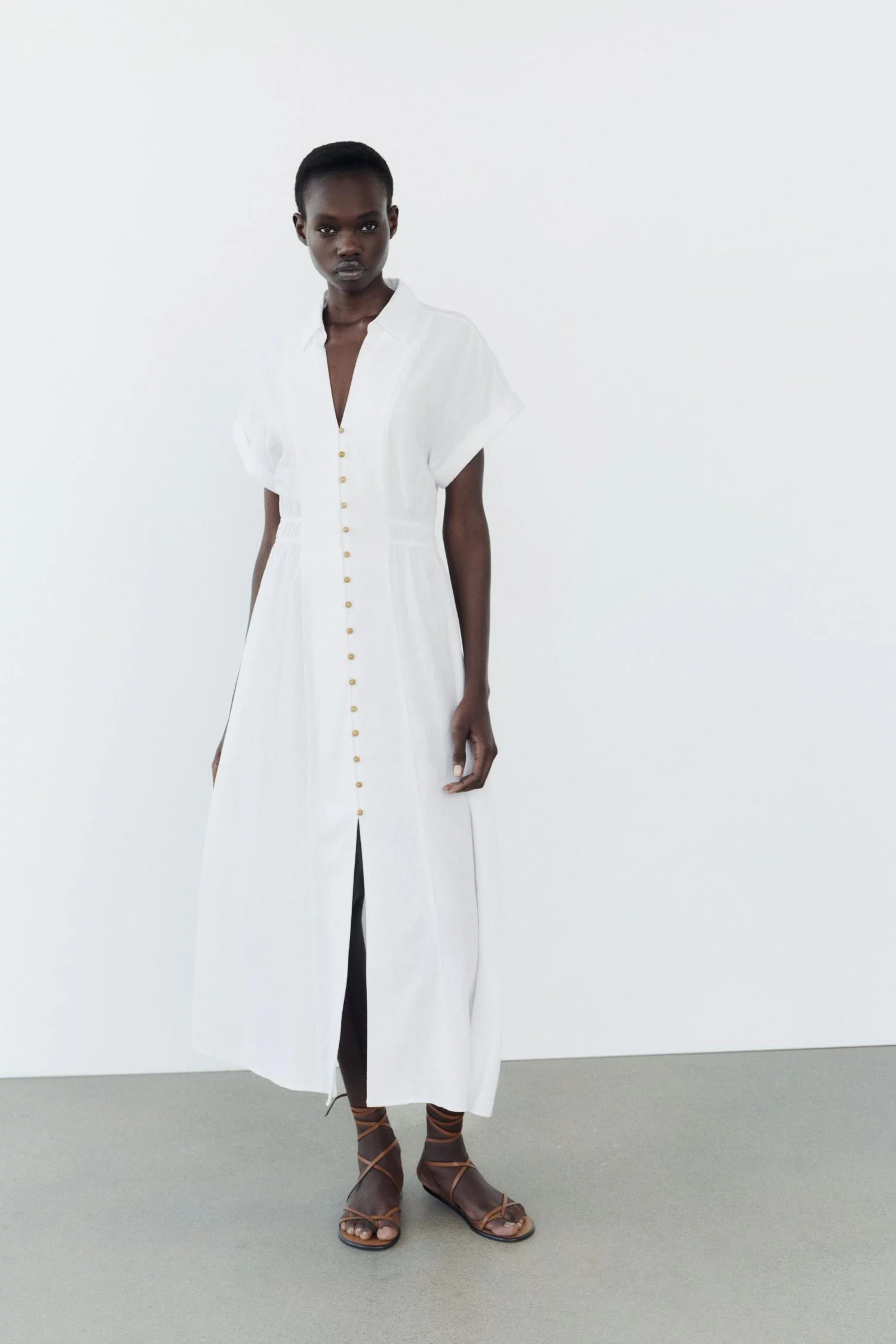 El tercero que nos ha enamorado es favorecedor vestido midi con estampado floral de escote pico con frunces y tirantes finos cruzados en espalda. Destaca por su delantero cruzado con frunces laterales y el bajo con abertura frontal. Un vestido perfecto para este verano que cuenta con un original cierre en espalda con cremallera oculta en costura. Este vestido 52% de lino, 46% viscosa y 2% elastano se puede encontrar en la web de Zara en las tallas de la XS y XL y a un precio de 29,95 euros.