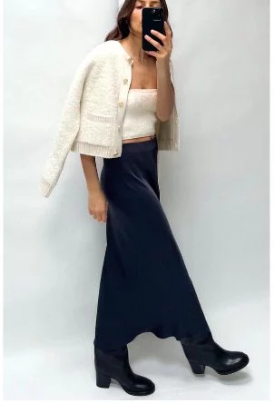 La falda midi satinada de Zara ofrece 4 hermosos tonos: marino, oliva, visón y crudo. Especialmente el tono marino contrasta fácilmente con muchas prendas neutras, por esta razón combina con un top, chaqueta, camiseta y prendas blancas. Por ejemplo el TOP BANDEAU PUNTO BOUCLÉ tiene un precio de 15,95 Euros y la CHAQUETA PUNTO BOUCLÉ a 35,95 Euros. Puedes aprovechar para usar unas BOTAS ALTA PIEL TACÓN ANCHO por tan solo 99,95 Euros. Los anteriores son accesorios ideales para esta falda que se convertirá en tu alternativa para un recorrido por las bellas calles de tu ciudad o cualquier compromiso formal que te hayas programado.