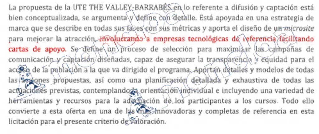 Según el documento firmado por Luis Prieto Cuerdo, director de Economía Digital de Redes, la UTE de Barrabés describe de forma «muy detallada las medidas de difusión del programa, las referidas a maximizar la participación y captación de la población diana y las medidas para adecuar los perfiles a la formación». Esta justificación es uno de los ejemplos que ponen en valor la oferta de la UTE de Innova y The Valley a la hora de rechazar otras ofertas.