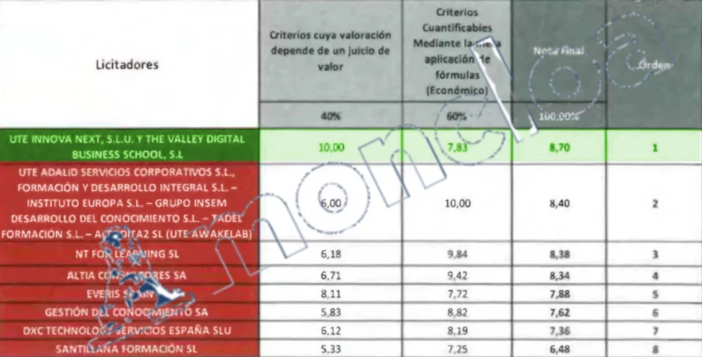 Y es que, según los criterios cuantificados mediante fórmula se quedó muy lejos de ser la mejor. En el lote 1, la UTE de Awakelab, conformada por Adalid Servicios y formación, Grupo Insem, Tadel Formación y Acredita2, rompió todos los registros en la parte económica, con la máxima puntuación -10 sobre 10 y con una parte que representó el 60% de la nota total-. No obstante, la valoración subjetiva fue de apenas seis puntos, cuatro menos de los obtenidos por la UTE de Barrabés.