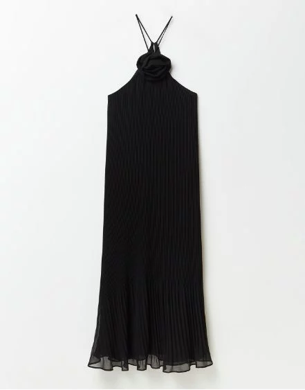 El VESTIDO LARGO PLISADO CON APLIQUE DE FLOR de Sfera, es el atuendo perfecto para realzar toda tu belleza y sentirte con mucha autenticidad. En esta oportunidad, este vestido es de color negro. Al ser un tono oscuro, este transmite seguridad y elegancia, por lo tanto puedes ser usar unos tacones que constrasten la belleza de esta sofisticada prenda diseñada a base 100% de poliéster.