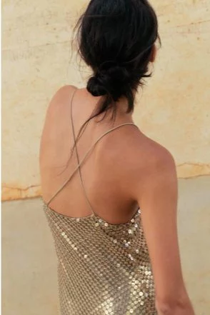 El VESTIDO MIDI LENCERO MALLA DORADA de Zara es una prenda de escote fluido y tirantes finos cruzados en espalda. Ayudándote a verte mucho más guapa y sofisticada con la delicadeza que se desprende de sus tirantes y sus fibras metalizadas, son un complemento elegante permitiéndote brillar con firmeza.