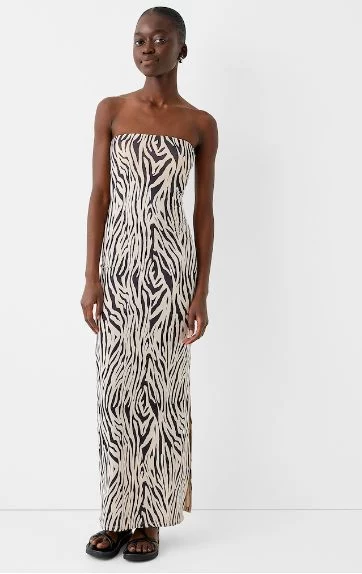 El Vestido midi bandeau de Bershka es el ideal para darte un toque de seriedad y elegancia, debido a sus dos colores blanco y negro, tonos neutros, siendo una combinación apropiada con otros accesorios que resaltarán esta prenda, como sandalias, bolsos y unas gafas de sol.