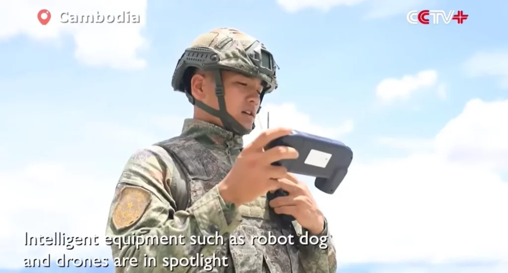 Los soldados controlaron uno de estos perros robot, de aproximadamente 15 kilogramos, mediante un control remoto. Este dispositivo cuenta con un sistema de percepción de plano ultra gran angular, proporcionando una vista amplia del entorno.