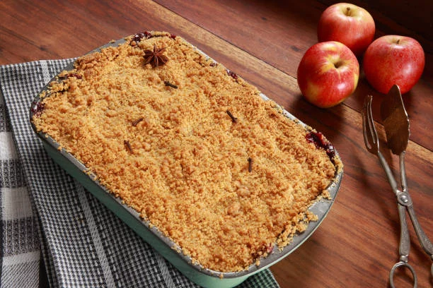 Se hornea la masa a 175 °C hasta que adquiera un ligero tono dorado y una estructura firme. Una vez enfriada la masa, se vierte sobre ella el relleno frío y se le agrega la gelatina sin sabor, asegurando una unión firme entre los ingredientes. Finalmente, se cubre la superficie con el crumble congelado para mantener su textura crocante durante la cocción en el horno precalentado a 170 °C. Tras dorarse en su punto, se deja enfriar a temperatura ambiente antes de cortar los cuadraditos de crumble de manzana y disfrutar de su exquisito sabor.
