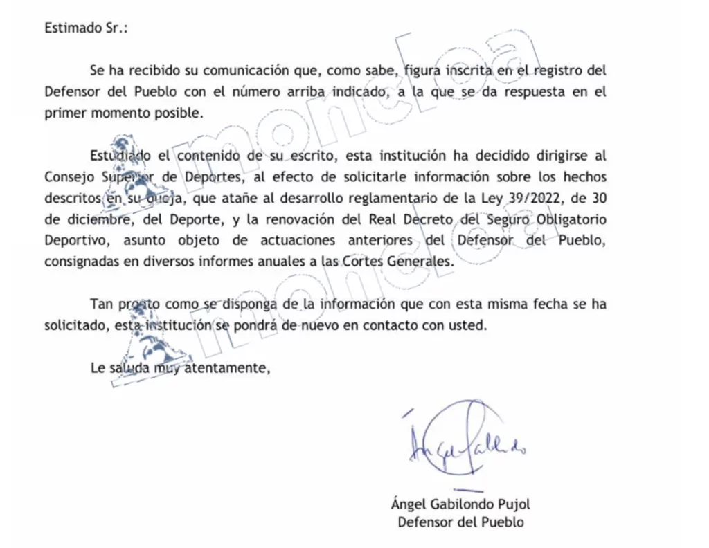 El Defensor del Pueblo ha decidido tras estudiar la queja llamar a la puerta del CSD para que se cumpla la ley del seguro obligatorio. Ahora, es el CSD quien debe responder al respecto. El propio Ángel Gabilondo dará respuesta una vez tenga la contestación del organismo encargado de velar por el cumplimiento de la ley, también de esta.