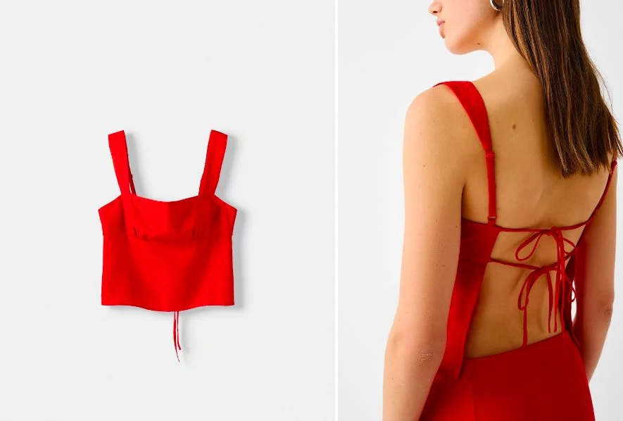 Este Top cropped lazado con lino color rojo de Bershka tiene un precio de 17,99 Euros y será más fácil encontrarlo con su número de referencia: 8807/692/600. Dependiendo de tus medidas, puedes elegir entre estas tallas: XS, S, M y L.