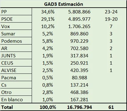 Las primeras estimaciones de GAD3 le dan el 34,6% al PP, seguido del 29,1% del PSOE de Teresa Ribera, que estaría el en EuroParlamento con un total de entre 19-20 escaños. El cabeza de lista de Vox a la Eurocámara, Jorge Buxadé, conseguiría entre 6 y 7 escaños, un resultado muy similar a los de 2019, pero que dejaría al partido como tercera fuerza política.
