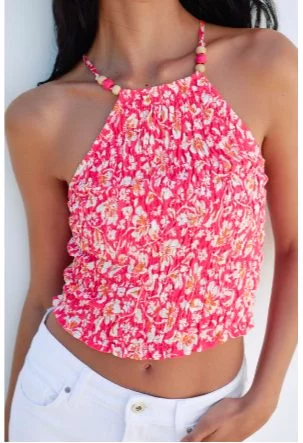 El TOP HALTER ESTAMPADO CUERPO ELÁSTICO color rosa de Zara es un Top corto de cuello halter con nido de abeja elástico. Tirantes finos cruzados en espalda con abalorios. Cierre trasero con lazada. Haciéndote sentir fresca y con un estilo único para usarlo en eventos informales o un almuerzo, cena o incluso, una cena romántica.