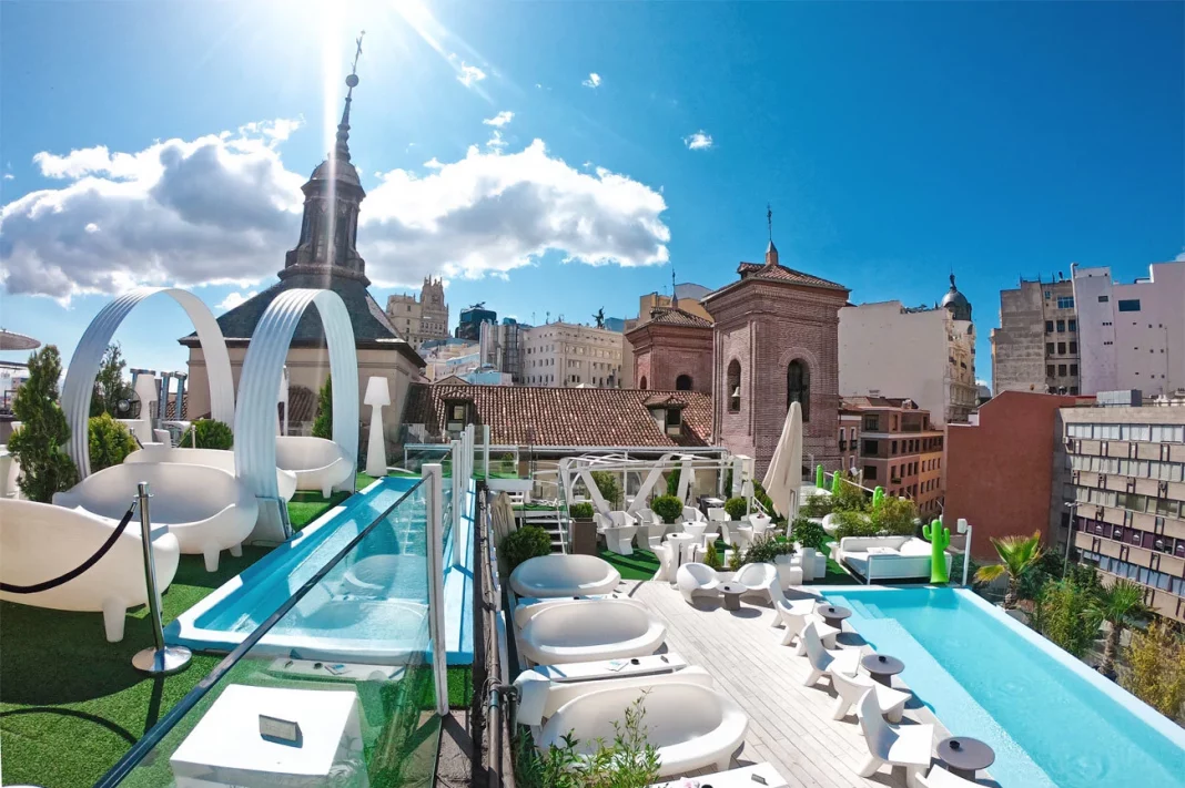 Esta azotea, está situada en el céntrico barrio de Malasaña, y logra combinar un ambiente relajado con vistas panorámicas de la ciudad. Cuenta con una piscina al aire libre y cómodas tumbonas, el Gymage Lounge Resort es el lugar perfecto para disfrutar de un día de relax bajo el sol madrileño.