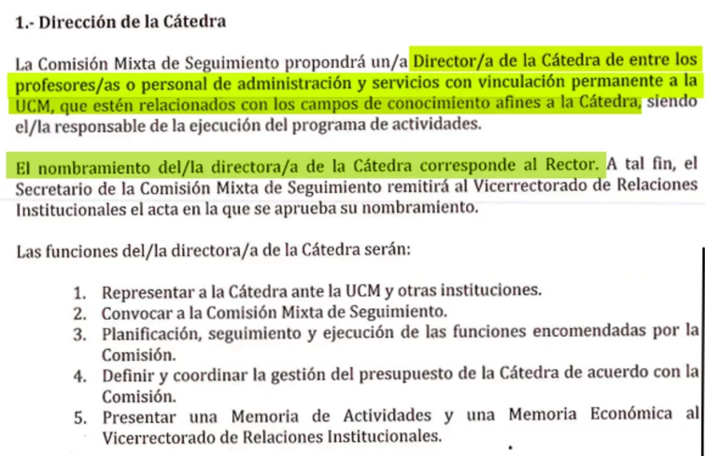 En el mismo docuemnto, el entonces vicerrector de Relaciones Institucionales, Juan Carlos Doadrio, aparece como delegado del rector, pero él no firma el fichaje de Begoña de Gómez ni tampoco se estipula en el convenio que deba ser la mujer del presidente del Gobierno quien deba ocupar el cargo en la cátedra extraordinaria. Nada más lejos. Tan sólo se señala las labores de la directora y los requisitos que debe cumplir, pero no se incluye con nombre y apellidos.