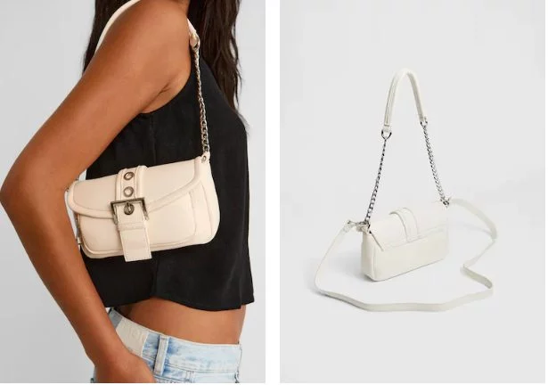 La bandolera hebilla color rojo de Stradivarius tiene un precio de 15,99 Euros y será más fácil encontrarla con su número de referencia:0502/611/100. También este tipo de bolso tiene otros dos colores: blanco y negro. Dos opciones muy apropiadas para combinar con tus espectaculares looks.
