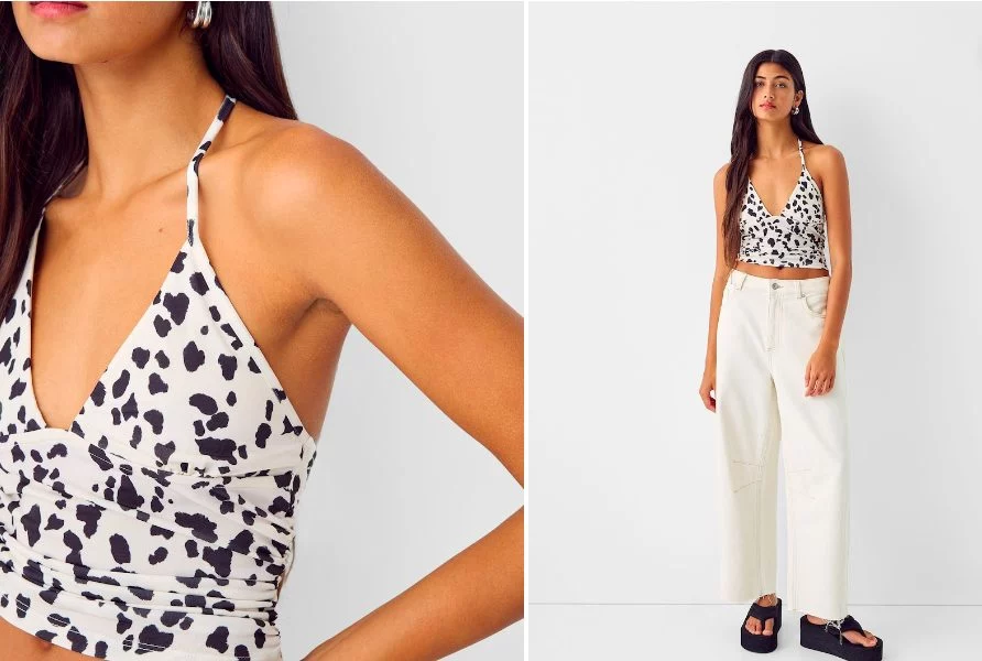 Este Top animal print de Bershka tiene un precio de 15,99 Euros y lo encontrarás fácilmente con su número de referencia: 8684/187/726. Dependiendo de tus medidas, puedes elegir entre estas tallas: XS, S, M y L.