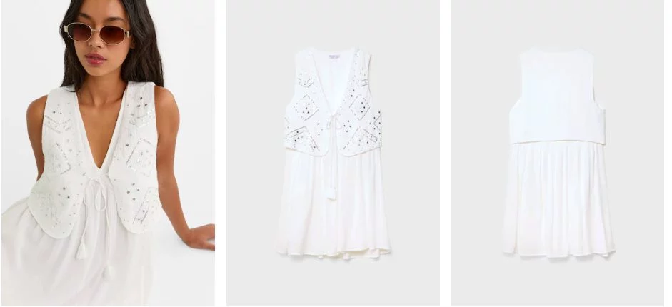 EL VESTIDO CORTO BAMBULA CON CHALECO color blanco de Stradivarius, es un vestido corto fluido de escote pico y manga sisa. Detalle de superposición de chaleco con cordones a tono y aplicación de lentejuelas. Tiene unos materiales que hacen única a esta prenda, ideal para eventos informales o de lo contrario, una cita o salida con tus amigas durante esta época de mucho calor:
