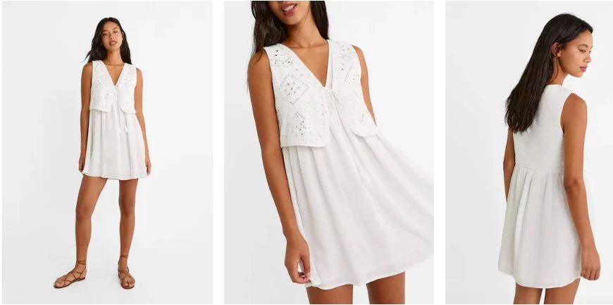 EL VESTIDO CORTO BAMBULA CON CHALECO color blanco de Stradivarius tiene un precio de 35,99 Euros y lo encontrarás fácilmente con su número de referencia: 2384/528/003. Dependiendo de tus medidas, puedes elegir entre estas tallas: XS, S, M, L y XL.