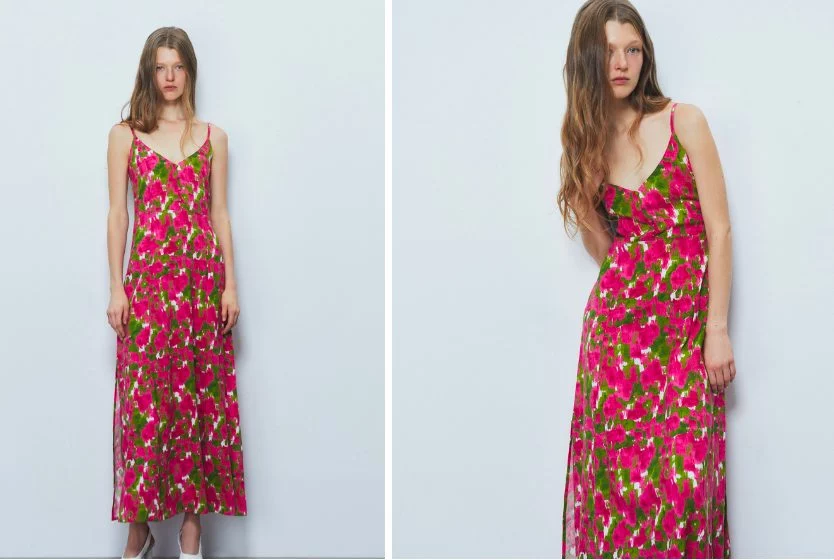 El primer vestido es un VESTIDO LARGO ESTAMPADO DE TIRANTES Y ESCOTE EN V. DETALLE DE BOTONES EN ESCOTE de Sfera, es la prenda ideal para reflejar la belleza de un jardín de flores, sus colores fucsia y verde contrastarán muy bien con tu esencia y belleza. Tiene un precio de 23,99 Euros y lo encontrarás fácilmente con su número de referencia: 58340003175. Dependiendo de tus medidas, puedes elegir entre estas tallas: S, M y L.