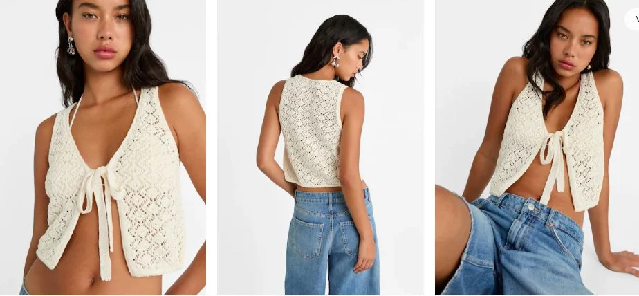 Además, este look no estará completo sin EL CHALECO CROCHET CORTO punto estilo crochet de Stradivarius de escote pico y manga sisa. Cierre frontal con lazada. Una prenda muy sofisticada que le dará ese toque especial a todo este conjunto. Tiene un precio de 19,99 Euros y lo encontrarás fácilmente con su número de referencia:5104/902/006. Dependiendo de tus medidas, puedes elegir entre estas tallas: XS, S, M y L.