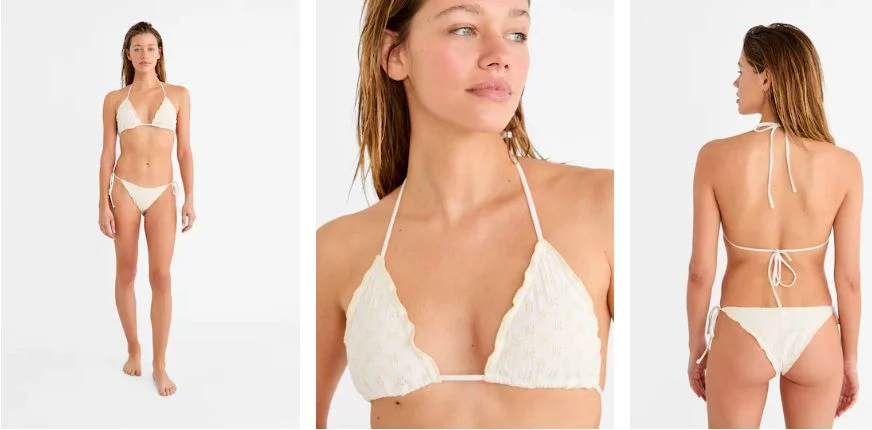 Para crear looks inolvidables en este verano, puedes combinar estos shorts con un TOP BIKINI TRIÁNGULO BORDADO de Stradivarius en forma de triángulo corredero con relleno extraíble y sin aros para un efecto natural. Detalle de bordados a contraste y acabados con volantes. Atadura posterior con tirantes finos anudados en la banda de la espalda y en la nuca. Tiene un precio de 15,99 Euros y será mucho más fácil encontrarlo con su número de referencia: 9035/923/004. Dependiendo de tus medidas, puedes elegir entre estas tallas: XS, S, M, L y XL.