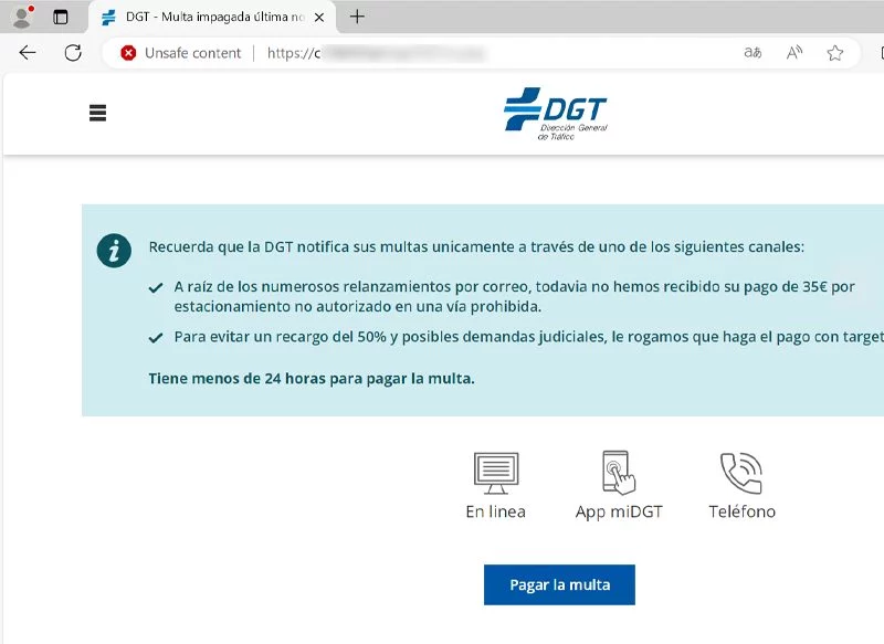 Desde el Instituto Nacional de Ciberseguridad (INCIBE) se ha informado de esta campaña de smishing en la cual se suplanta a la DGT, una técnica que consiste en el envío masivo de mensajes de texto, donde se informa a las víctimas que los reciben que tienen una multa sin pagar, instándoles a que emitan el pago de la misma en un plazo de 24 horas o se les engaña haciéndoles creer de que ese mensaje es el último recordatorio.