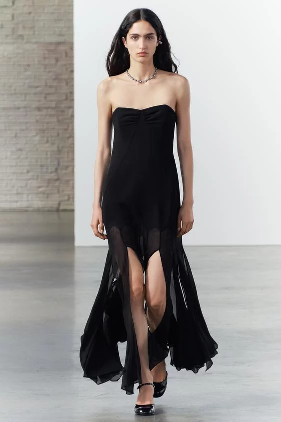 Este vestido cuenta con un bajo muy largo y seguro que queda muy bien con un zapato o unas sandalias de tacón destalonadas en color negro. Se puede encontrar en la web de Zara en tallas de la XS a la XL y a un precio de 79,95 euros.