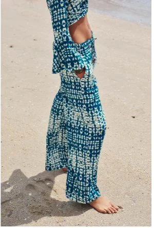 Puedes combinar este cuerpo estampado con un PANTALÓN ANCHO ESTAMPADO con los mismos tonos azul y blanco, ideal para llevarlo a eventos formales, pero también arriesgarte y usarlo en exteriores paradisíacos como puede ser la playa, un parque a las afueras de tu ciudad o un desierto. Este pantalón tiene un precio de 29,95 Euros y será fácil encontrarlo con su número de referencia: 3564/116. Dependiendo de tus medidas, puedes elegir entre estas tallas: XS, S, M, L y XL.