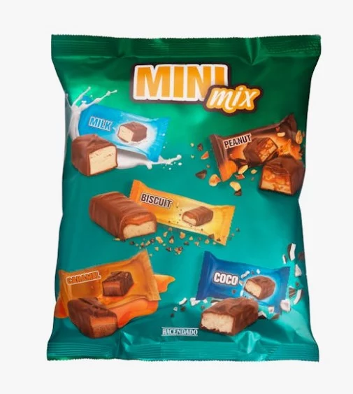 Mix mini de Mercadona ofrece en una bolsa diferentes variedades de barritas de chocolate: una con cacahuetes, otra a base de leche, otra con coco, otra de caramelo y una última con caramelo. El surtido está compuesto por cuatro barritas de cada sabor.