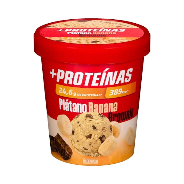 El helado +Proteínas sabor plátano con trozos de brownie Hacendado es un producto que aparece y desaparece de los congeladores y que se ha convertido en una buena opción para los que quieren tomar helados en verano y no aportar muchas calorías a su organismo. De hecho este helado ha tenido una gran repercusión en redes sociales como TikTok o Instagram y hay muchos vídeos en los que se comenta el sabor o la textura de este helado. Por ejemplo en este vídeo de TikTok lo prueban y lanzando su veredicto.