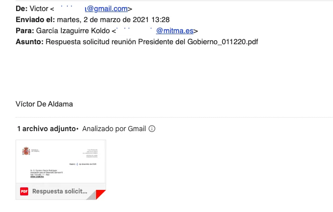 Esa misma carta de Iván Redondo fue enviada como documento adjunto por Víctor de Aldama desde un correo particular al correo corporativo de Koldo García el 2 de marzo de 2021 con el asunto «respuesta solicitud reunión Presidente del Gobierno». Es decir, que el asunto de las mascarillas no había sido algo puntual, sino que la colaboración y el contacto entre ambos se mantuvo en el tiempo.