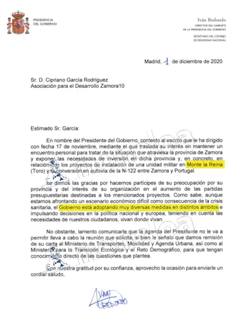 El 1 de diciembre de 2020, Iván Redondo, entonces jefe del Gabinete de Pedro Sánchez, respondía amablemente a la citada asociación, presidida por Cipriano García, que además es el director general de la Caja Rural de Zamora, donde le daba «las gracias por hacernos partícipes de su preocupación por su provincia y del interés de su organización en el aumento de las partidas presupuestarias destinadas a los mencionados proyectos» y aprovechaba para hacer política: «aunque estamos afrontando un escenario económico difícil como consecuencia de la crisis sanitaria, el Gobierno está adoptando muy diversas medidas en distintos ámbitos e impulsando decisiones en la política nacional y europea, teniendo en cuenta las necesidades de nuestros ciudadanos, vivan donde vivan».