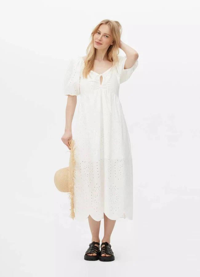 Por otro lado, se encuentra el Vestido midi con bajo festoneado y manga abullonada compuesto por 100% algodón. Tiene un precio de 28 Euros y podrás encontrarlo fácilmente con su número de referencia: 991099664002. Dependiendo de tus medidas, puedes elegir entre estas tallas: 34, 36, 38, 40, 42, 44, 46, 48 y 50.
